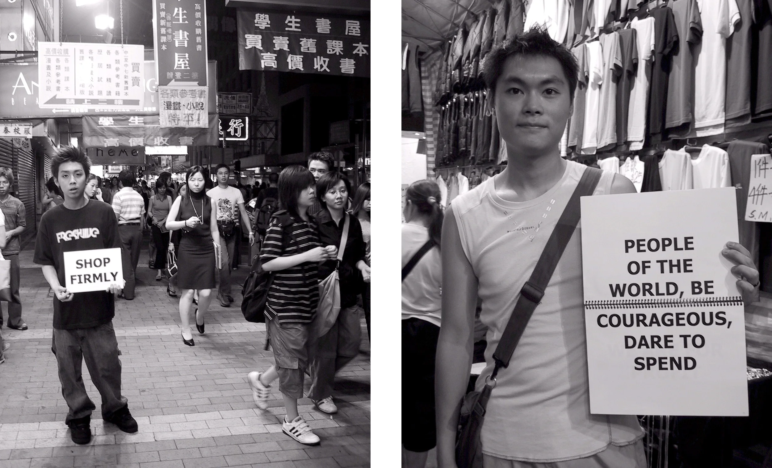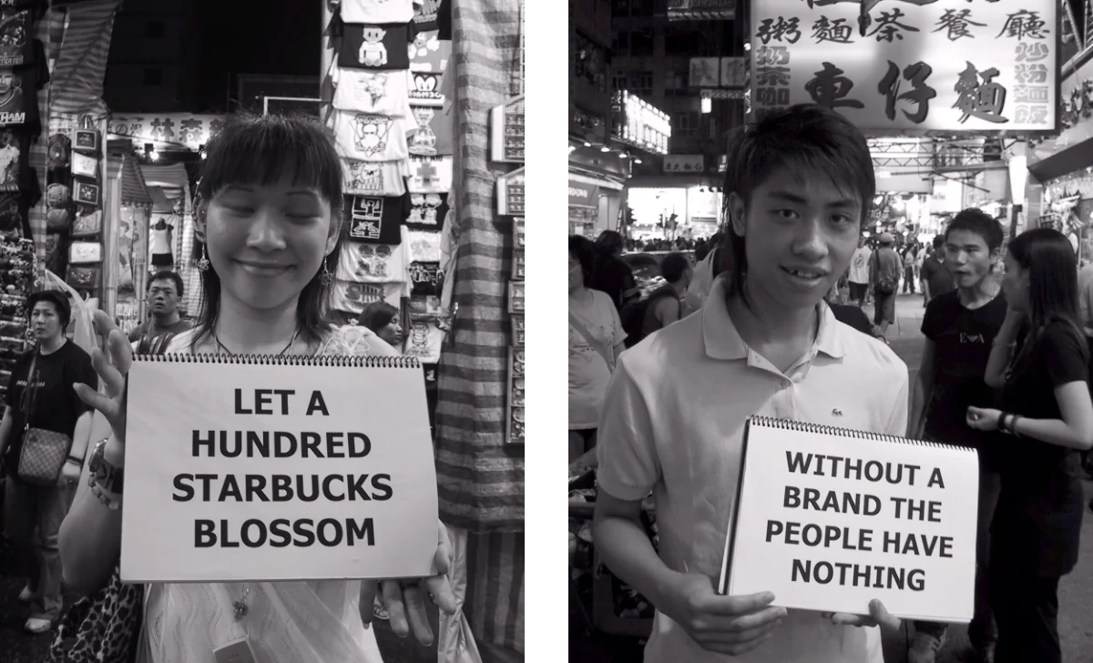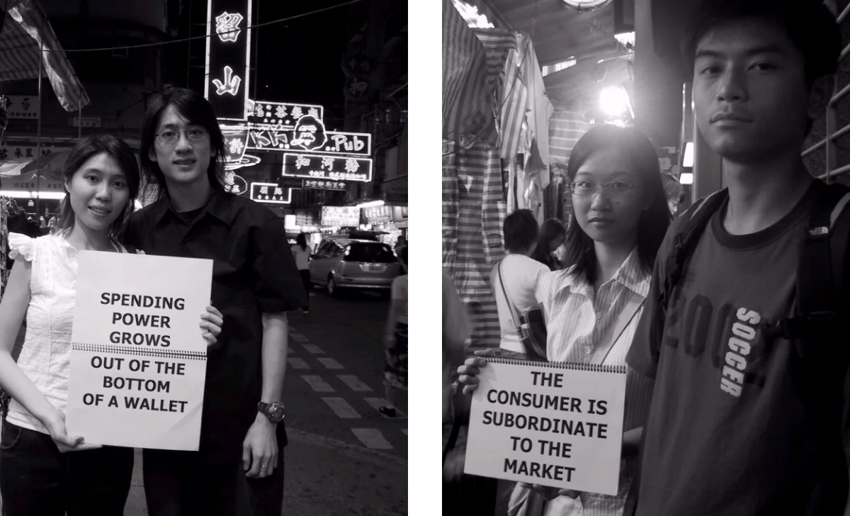 Since the 1980s when Deng Xiaoping said, “to be rich is glorious,” China has been trying to reconcile the communist principles on which the People’s Republic was founded and its escalating acceptance of capitalism. This paradox is explored in a collection of twenty-three photographs of Hong Kong youth in Mong Kok, a popular street market in Kowloon. Each participant holds a sign bearing a phrase from the 1966 Quotations from Chairman Mao Tse-Tung. By changing one or two words, the quotes have all been subverted to support capitalism instead of communism, forming a Little Red Book for twenty-first century China.